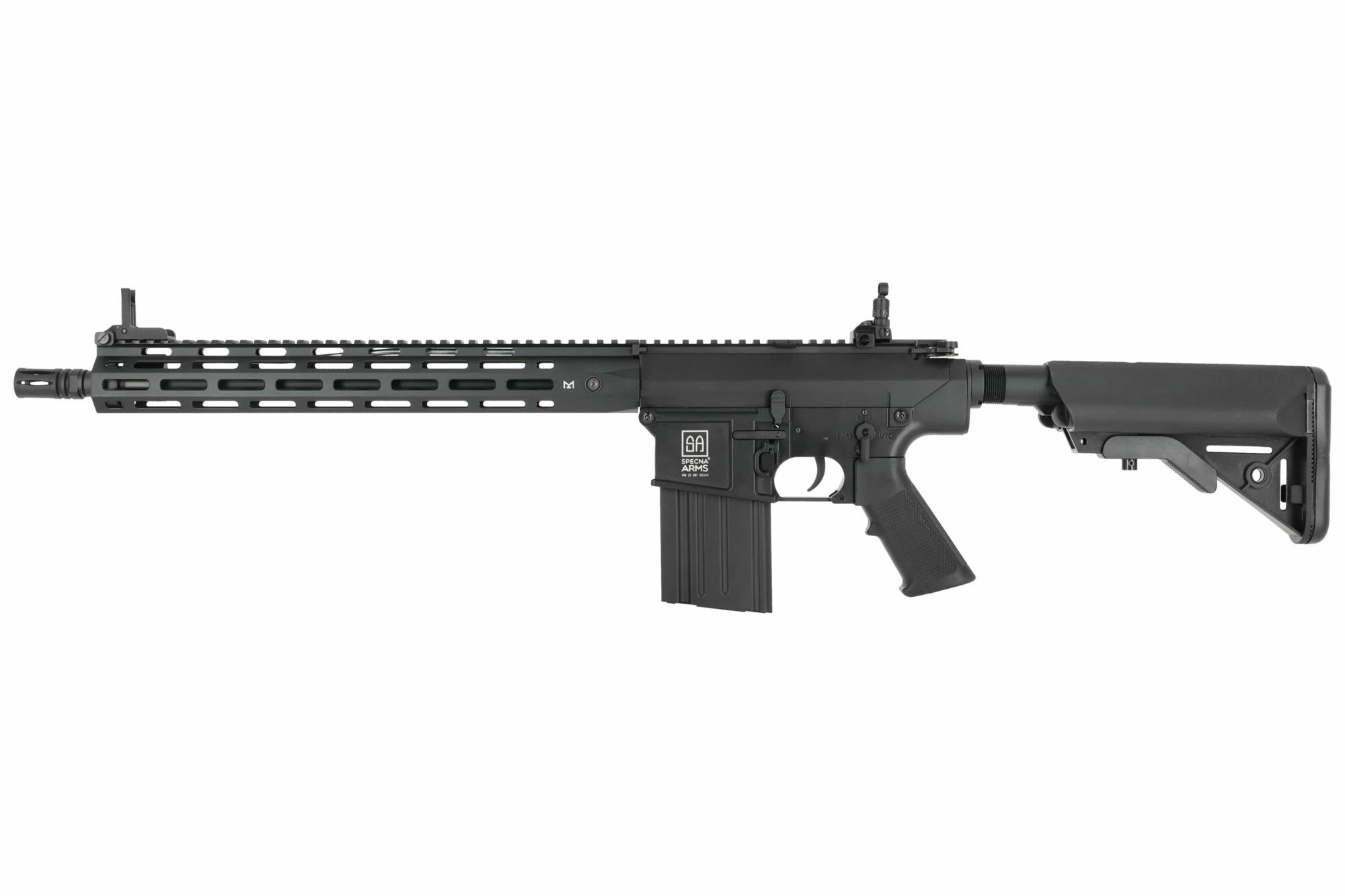 The SA-E35 also focuses on ergonomics and upgrade potential. It features a top Picatinny rail complementing the M-LOK handguard, allowing the installation of an optic, a tactical grip, or a laser. Its retractable stock allows you to adjust the overall length of the replica during different phases of play or according to your build. Its 430 mm inner barrel, adjustable hop-up, velocity of 428 FPS for 1.7 Joules, and 14 mm CCW thread complete a configuration designed to provide a high-performance DMR base.