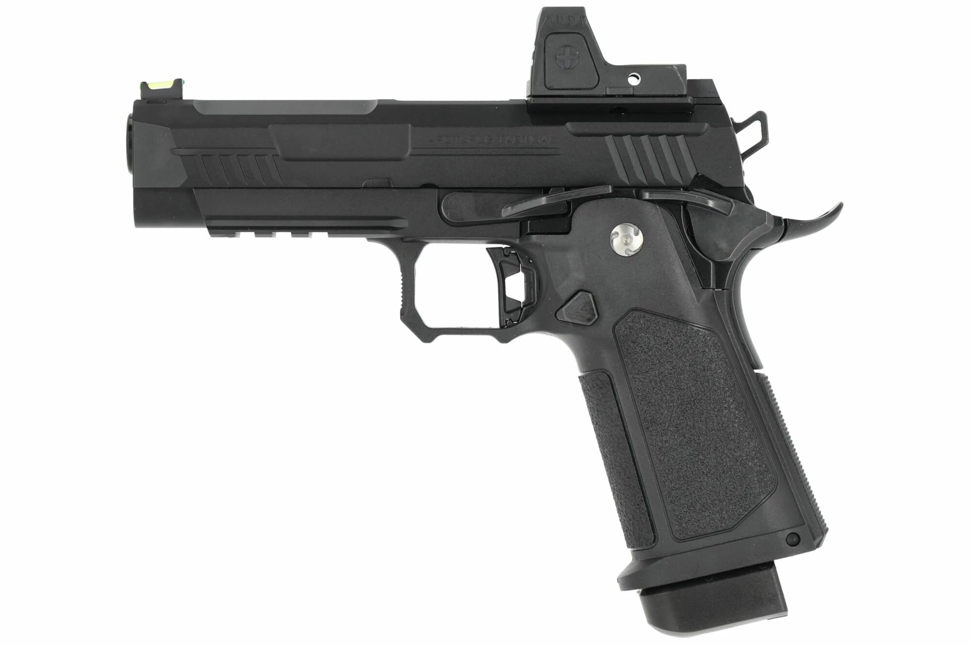 The base is based on a Hi-Capa 4.3 Gas Blowback platform, appreciated for its shorter format than the long versions, with a footprint better suited to fast movements, weapon transitions and uses where compactness really counts. Here, Arcturus combines a metal bolt with a textured, reinforced nylon fiber grip, reflecting its quest for a balance between rigidity on the moving part and a secure grip on the gripping part. The fiber optic sights are still present, while the ambidextrous mag release is of real practical interest for fast handling and players who want a more open ergonomic design to suit their shooting style.