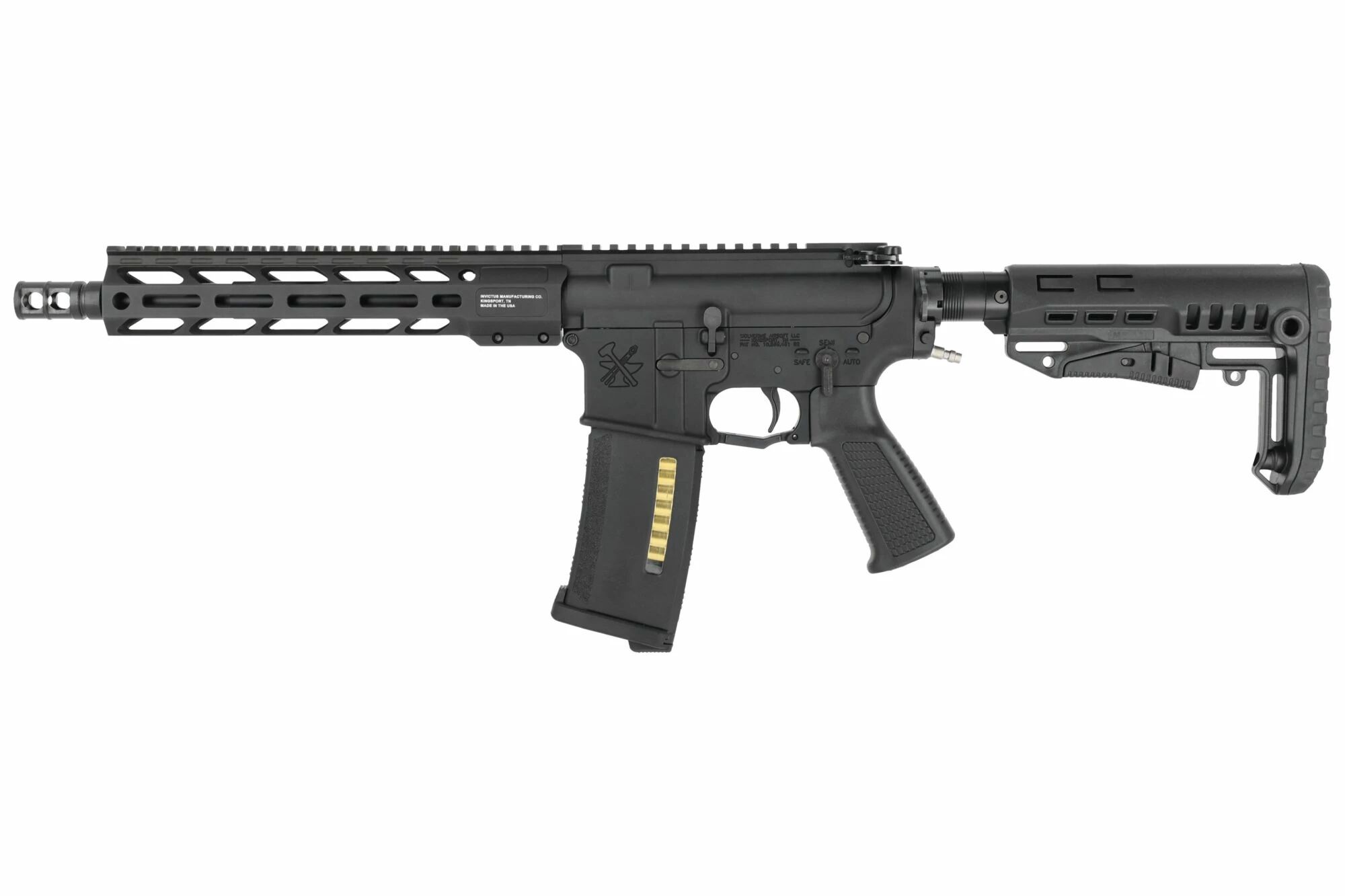 En configuration Tactical, la réplique est associée au garde-main Invictus MK2 aux fixations M-LOK avec un rail Picatinny supérieur, conçu pour faciliter l’accessoirisation avec une optique de visée, une lampe tactique ou une poignée avant, tout en gardant une ligne moderne et fonctionnelle. On retrouve également un grip DLG Premium Real Steel et une crosse DLG Heavy-Duty Milspec, ainsi qu’un montage HPA pratique via un connecteur de ligne arrière fixe (FRAC). La finition est complétée par un cache-flammes de la gamme Invictus, généralement monté sur un filetage 14 mm CCW, ce qui laisse la possibilité d’adapter facilement l’équipement en bout de canon.