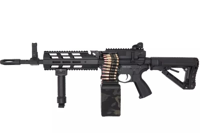 La LMG CM16 cuenta con una culata de cráneo ajustable, un M-Lock y un guardamanos Picatinny, un botón de expulsión del cargador ambidiestro y una caja de munición eléctrica de 2.500 balas con cartuchos ficticios incluidos. También encontrará una empuñadura táctica que se convierte en bípode.