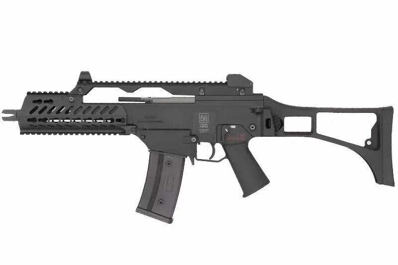 En cuanto a prestaciones y configuración, la réplica cuenta con un cañón interno de 270 mm, un Hop-Up ajustable y un cargador Hi-Cap con capacidad para 350 bbs. Se trata de un formato versátil, capaz de mantenerse maniobrable al tiempo que conserva la arquitectura característica del G36.