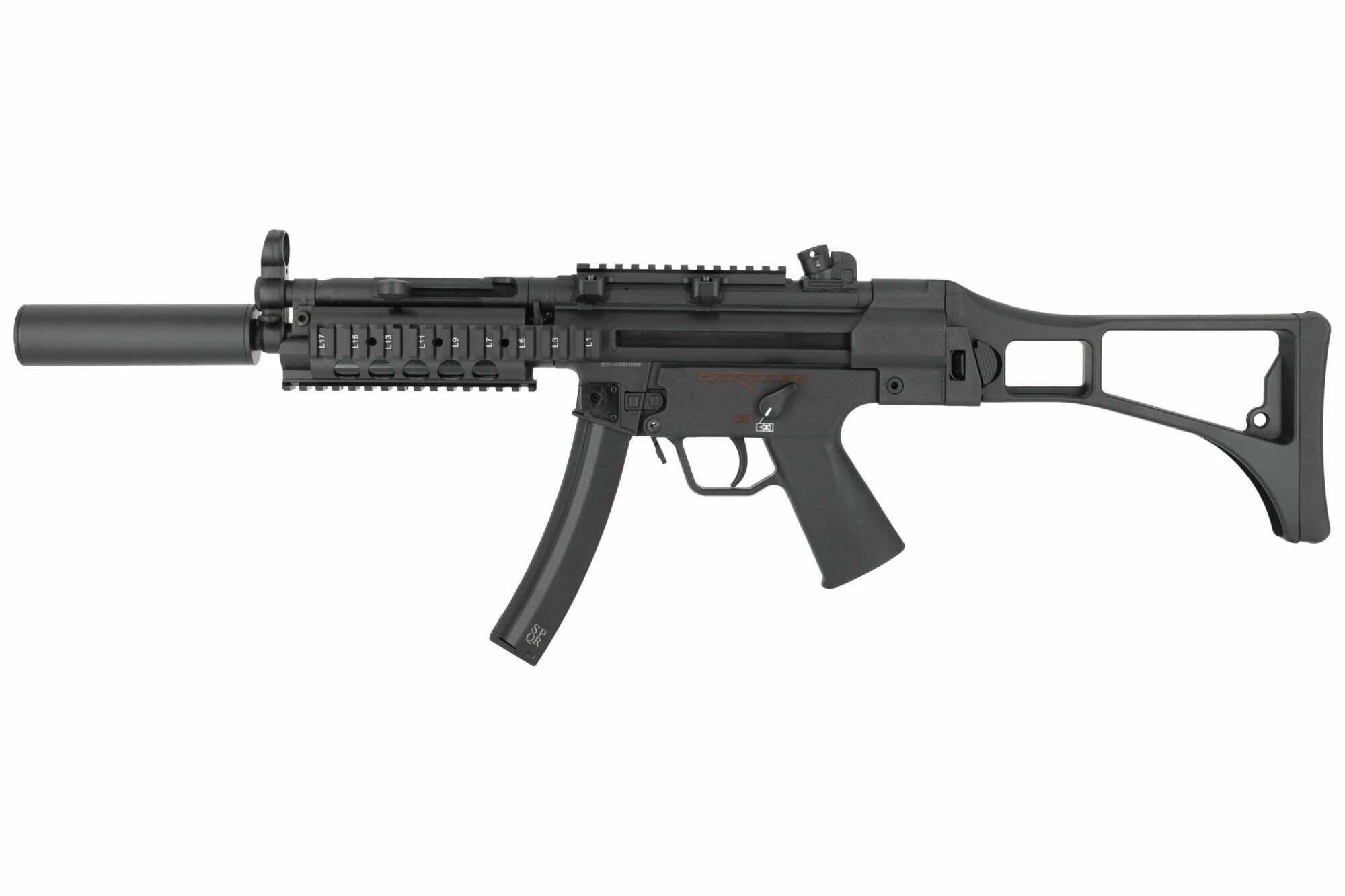 " J'apprécie beaucoup l'esthétique des MP5 customisées de chez SECUTOR. Celle-ci avec son silencieux et sa crosse pliable type G36 est très structurée. Son sélecteur de tir ambidextre facilite sa manipulation pour un gaucher comme moi. "