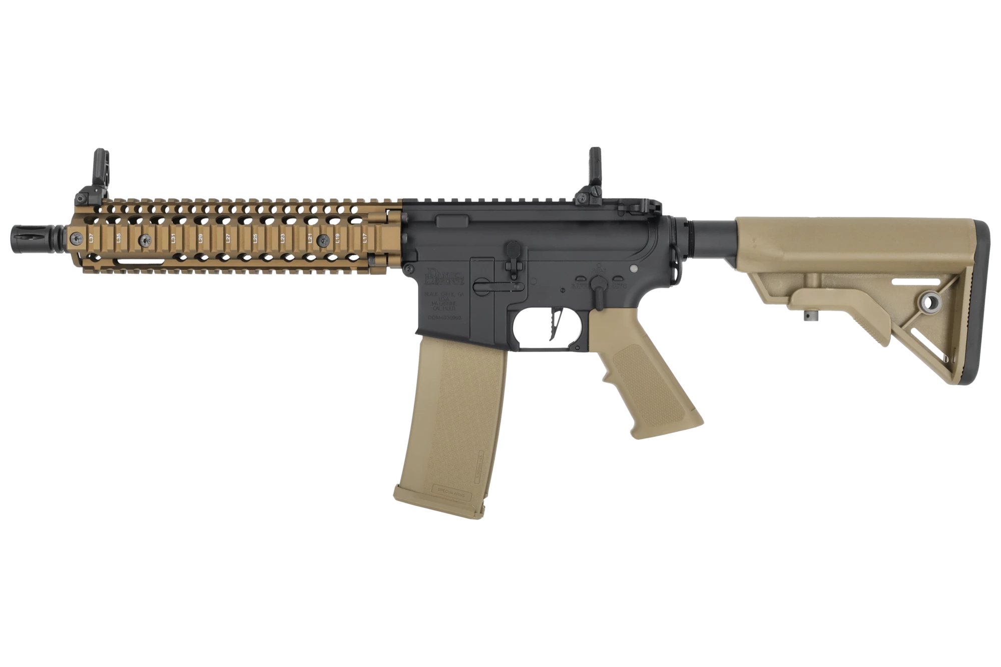 La MK18 SA-E19 EDGE HAL ETU Daniel Defense Chaos Bronze de Specna Arms es una réplica eléctrica dirigida a los jugadores que buscan una plataforma M4 compacta y con gran capacidad de respuesta que rinda nada más sacarla de la caja. Desarrollada en cooperación entre EMG Arms y Specna Arms, cuenta con marcas de licencia Daniel Defense y un número de serie individual confirmado por holograma, lo que refuerza su identidad premium.